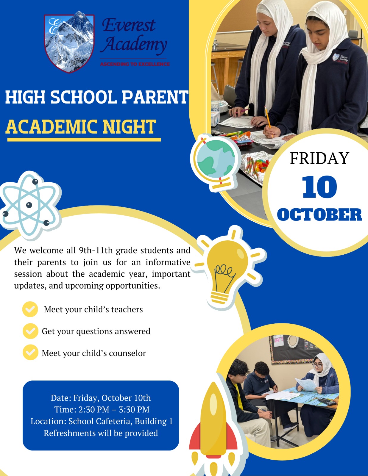 Everest Academy shall strive for excellence in preparing its students for tomorrow’s challenges and for the Hereafter by providing them with an exceptional academic experience in an Islamic environment, thereby empowering them to become successful Muslim-Americans.